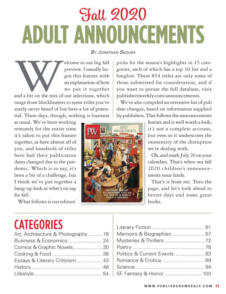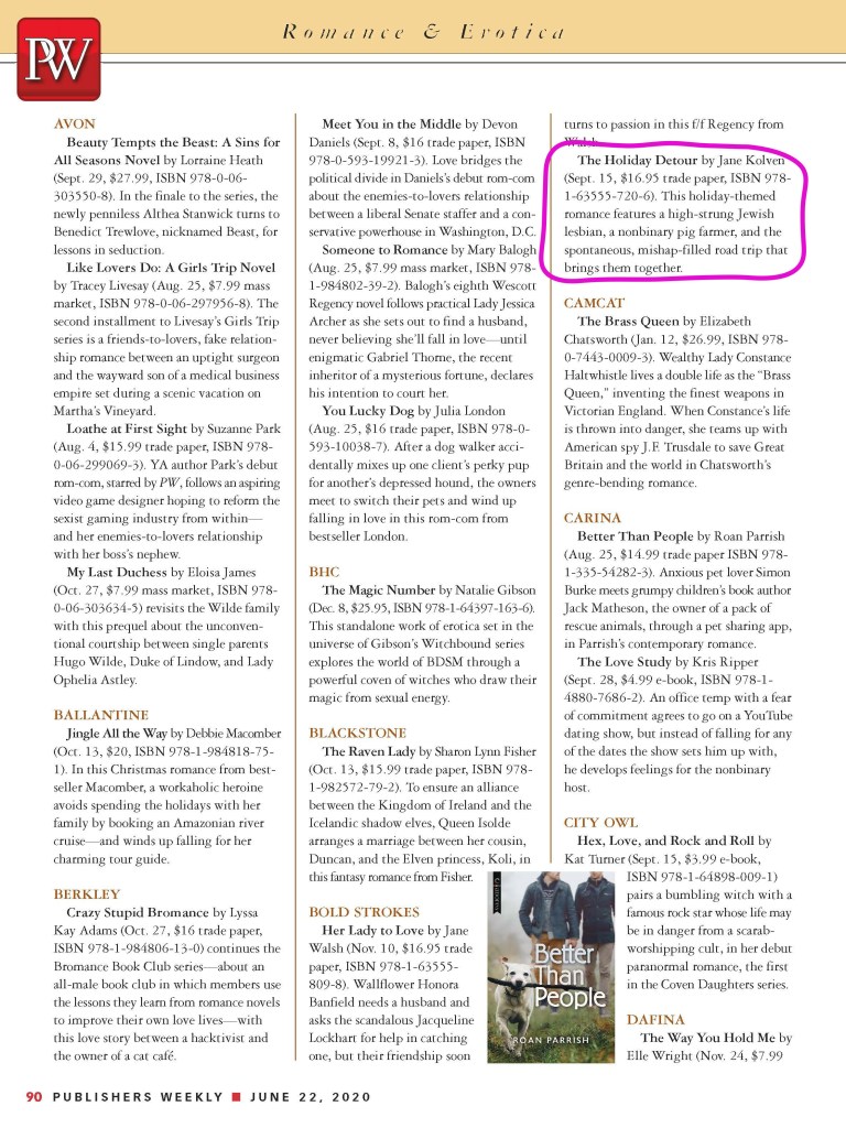 June 22, 2020. Publishers Weekly names The Holiday Detour as a recommended fall romance read.